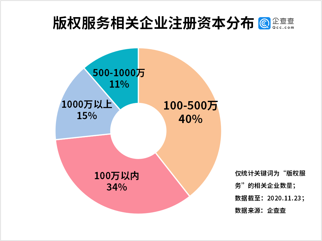 從注冊資本的角度來看,企業搜索數據顯示,注冊資本在1-5億元人民幣的版權服務相關公司數量相對較大, 注冊資本在100萬元以下的占34%,占第二位,占40%。 總體而言,有74%的企業注冊資本不足500萬。