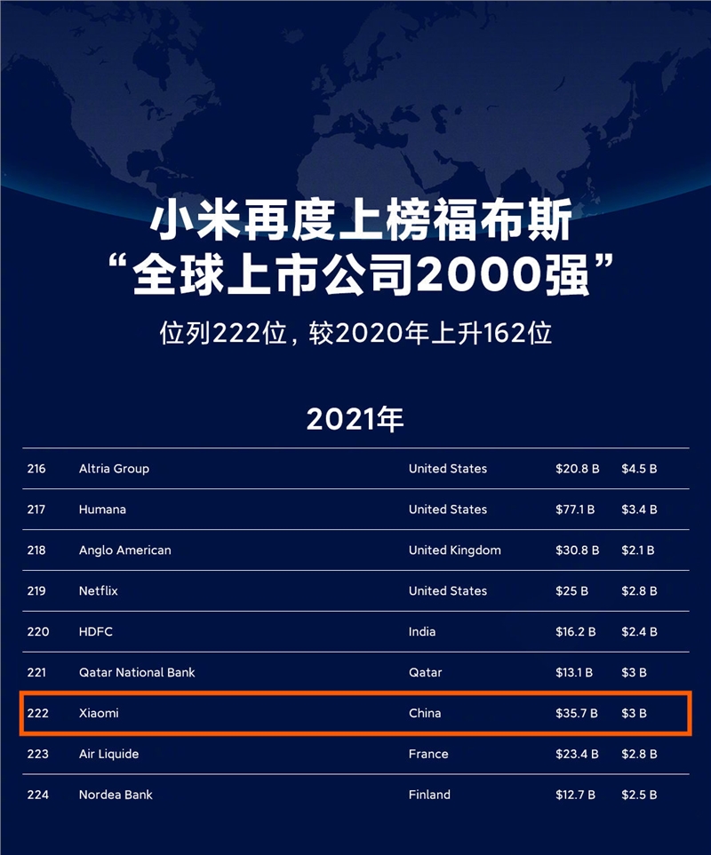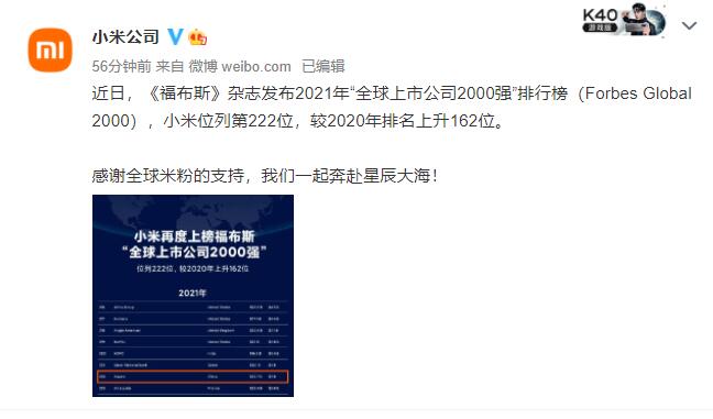 今天小米公司發(fā)布微博稱,近日,《福布斯》雜志發(fā)布2021年「全球上市公司2000強(qiáng)」排行榜(Forbes Global2000),小米位列第222位,較2020年排名上升162位。